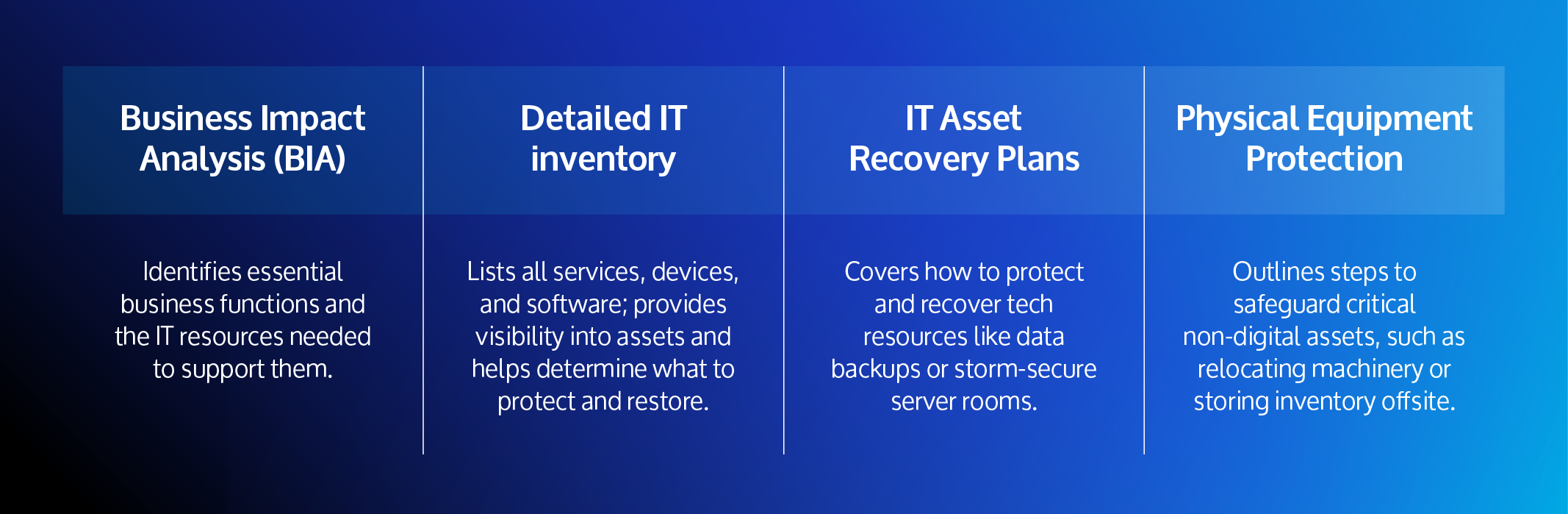 Business Impact Analysis (BIA) Detailed IT inventory IT Asset Recovery Plans Physical Equipment Protection